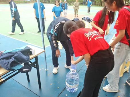 活动现场,青马班志愿者们提前备好充足的饮用水,在军训场地的服务点为军训同学提供服务。他们身着统一服装,分工明确、热情满满,手持水桶和水杯,为汗流浃背的新生递上清凉解渴的饮用水。同时时刻关注新生训练状态,一旦发现有同学出现体力不支、脚步不稳的情况,便立即上前搀扶至阴凉处休息,并细心询问身体状况,提供必要的帮助。