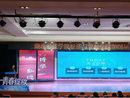 (通讯员:柯学、李想;审稿人:张建军)为扎实推进毕业生实习就业工作,帮助学子明确职业方向、衔接职场赛道,2025年10月12日晚7点,湖北科技学院经济与管理学院2026届毕业生实习就业启动大会在学术报告厅举行。院长定光平教授、副院长张建军教授,毕业班辅导员以及2026届全体毕业生共同参会。特别邀请和乐门业集团、北京兴昌华会计师事务所(特殊普通合伙)湖北分所等企业代表参会。