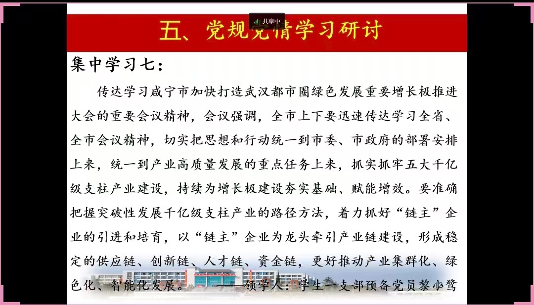 (通讯员:张刘文析喻瑜;审稿:刘波)2026年3月19日,经管学院学生一支部开展了2026年第三期主题党日活动,集中学习了《习近平在中共中央政治局第二十四次集体学习时强调发挥比较优势 坚持稳中求进 推动我国未来产业发展不断取得新突破》《习近平春节前夕在北京看望慰问基层干部群众》《习近平:在二〇二六年春节团拜会上的讲话》《咸宁市加快打造武汉都市圈绿色发展重要增长极推进大会举行》等一系列学习材料。支部党员老师以及全体学生党员参与此次活动。