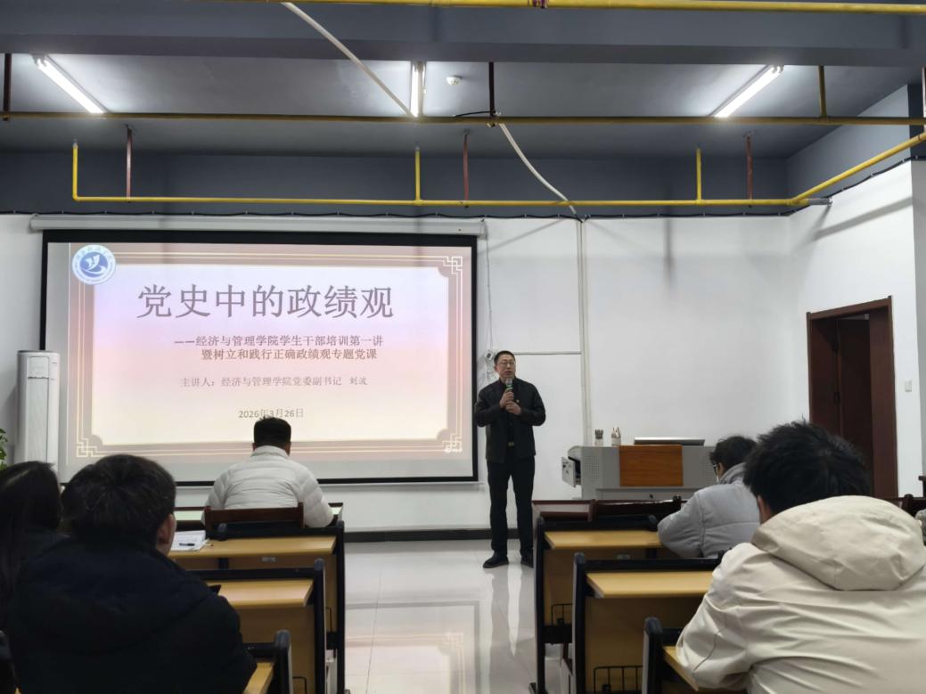 (通讯员:杨萌;审稿:黄瑞春 刘波)3月26日下午,经济与管理学院在揽胜楼1403教室举办2026年度团委学生会学生干部培训会第一讲。由学院党委副书记刘波主讲《党史中的政绩观》专题党课。