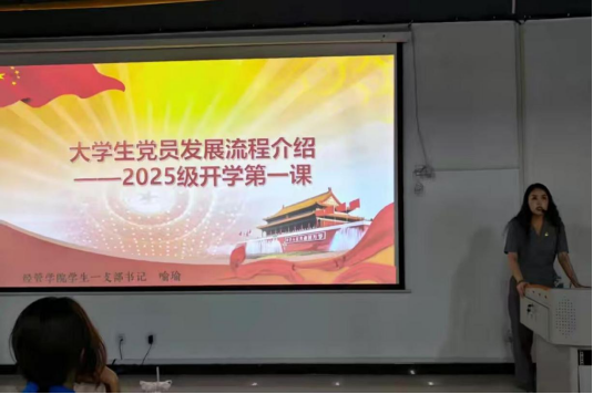 (通讯员:张刘文析;审稿:吴乐盈 刘波)2025年10月10号,经济与管理学院党委面向2025级新同学开展了一堂以《大学生党员发展流程介绍》为主题的专题党课,本次党课由学院学生一支部书记喻瑜老师主讲。