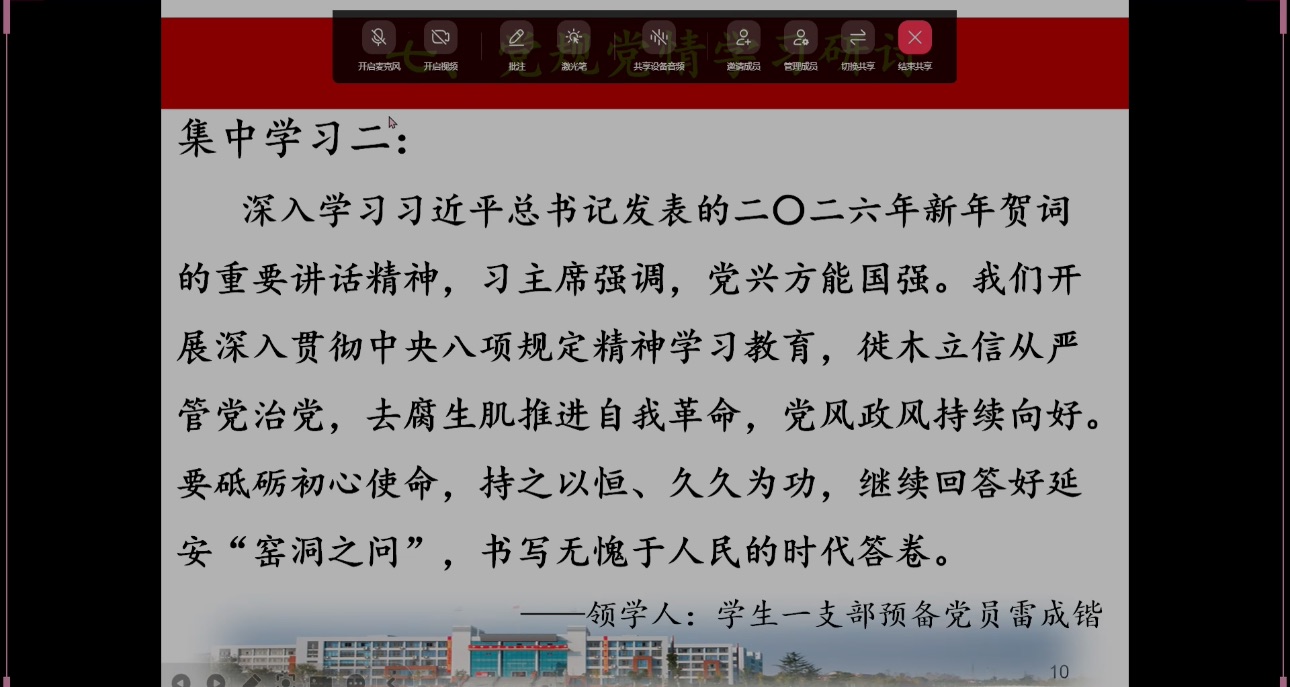 (通讯员:张刘文析 审稿:刘波)2026年1月22日,经管学院学生一支部开展了2026年第一期主题党日活动,集中学习了《中共中央政治局召开民主生活会强调 锲而不舍落实中央八项规定精神 以优良作风凝心聚力真抓实干》、《国家主席习近平发表二〇二六年新年贺词》、《中央经济工作会议在北京举行 习近平发表重要讲话》、《<求是>杂志发表习近平总书记重要文章<推进党的自我革命要做到“五个进一步到位”>》《中共中央组织部下发通知要求在元旦春节期间开展走访慰问生活困难党员、老党员、老干部活动》等一系列文件精神。支部党员老师以及全体学生党员参与此次活动。