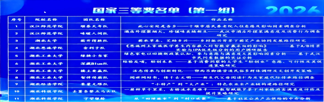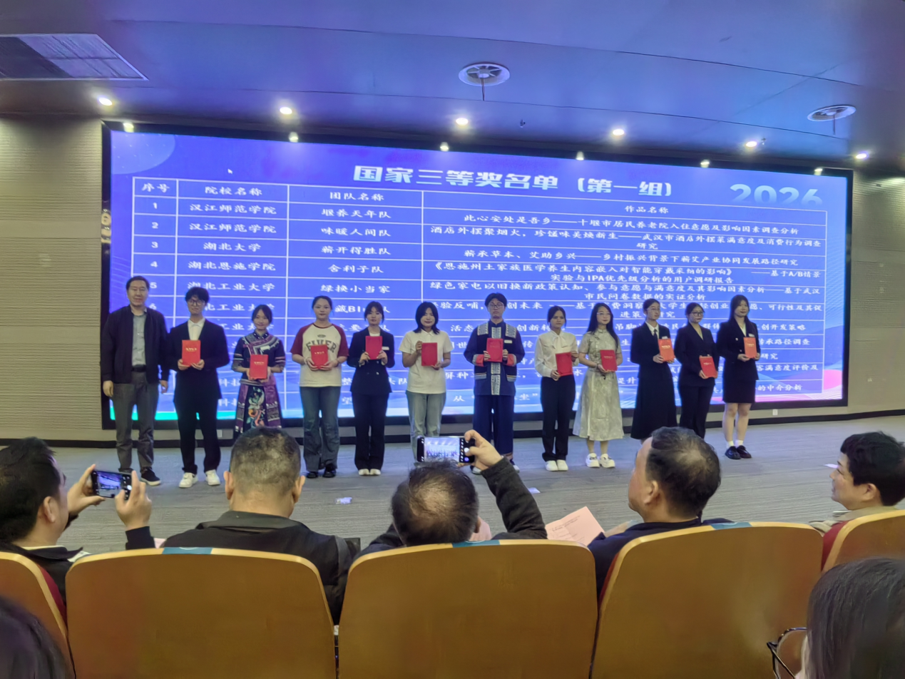 本届全国大学生市场调查与分析大赛湖北省本科组决赛在华中师范大学举行,由中国商业统计学会主办、正大集团冠名、华中师范大学承办。由我校经济与管理学院工商管理专业本科生“去薯条整点马头队”(指导老师:陈鹏、尹文珺;队长:王玲梅;队员:莫琳琳、唐小雪、张雅丽、黄淇淇)凭借《一屏种草千里至,古桥流水意难平——数智赋能背景下刘家桥游客满意度评价及提升策略研究》和多专业组合的本科生“守望银龄队”凭借《从“田埂孤坐”到“村口欢聚”—基于社区公共产品供给的中介分析》(指导老师:吴清华,队长:口腔医学专业学生黄舒萍,队员:工商管理专业孙艺丛、经济学专业杨欣灵、眼视光医学专业周讯、视觉传达设计专业黎启涛)均获得国赛三等奖及湖北省赛一等奖。两支团队创新采用跨学科研究方法,聚焦农村文旅融合与农村养老等社会热点,提出切实可行的对策方案,获评审专家高度评价。
